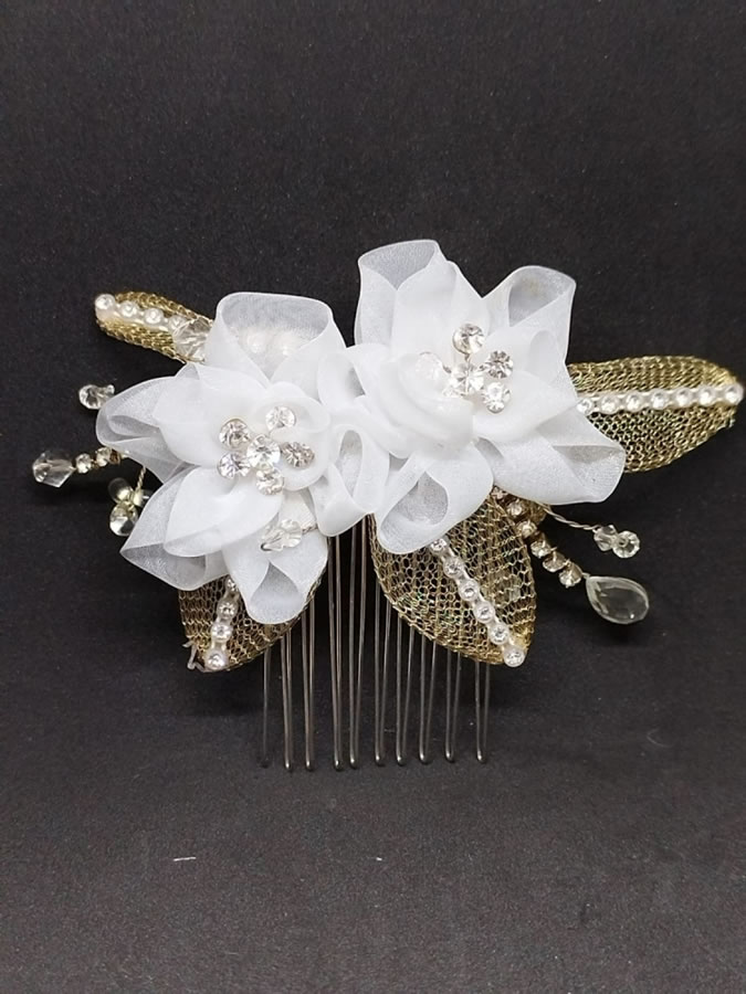 Peineta decorada con flores, hojas y cristales hecha a mano. Ideal para una primera comunión, novia o para una actividad formal. Accesorio de cabello.