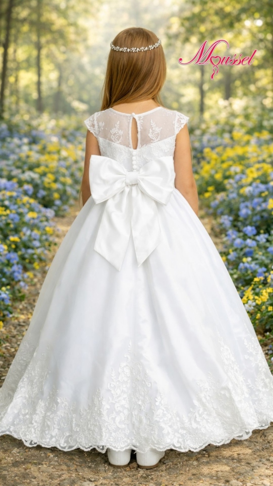 Sueño de Luz:Diseño de tirantes y falda amplia con sutil aplicación, ideal para una ceremonia perfecta. Es un diseño que tiene una hermosa cola.