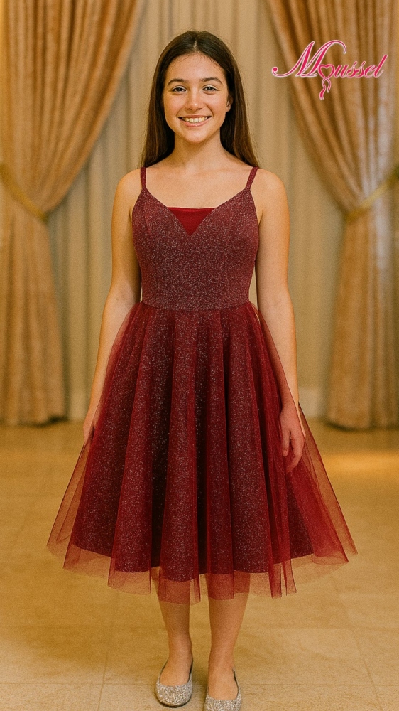 Cuando de sonreir se trata y estio en vino tinto, línea en A con su tela escarchada es una excelente opción para disfrutar de la fiesta.