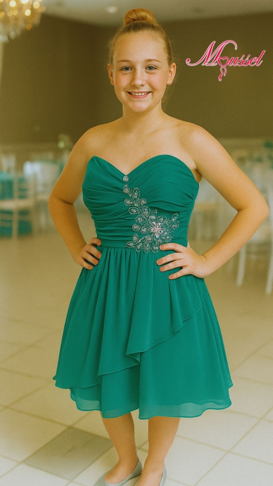 Jade: estilo línea en A y con una falda de chifón hará de tu fiesta un día muy especial. Brilla!