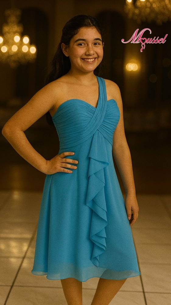 Vestido juvenil azul con diseño asimétrico de un solo hombro y detalle drapeado en cascada. Moderno y fresco, ideal para graduaciones, fiestas y eventos especiales