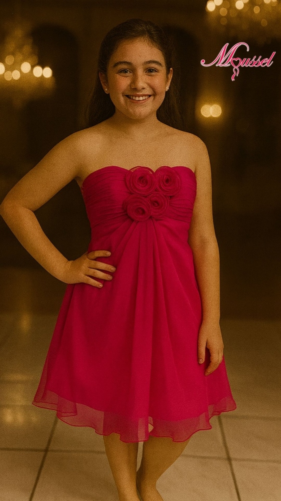Vestido corto en tono fucsia con detalle de flores en el busto. Un diseño fresco, juvenil y romántico, ideal para destacar en celebraciones especiales.