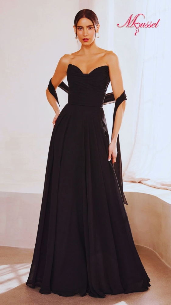 Vestido noche majestuosa:  este vestido es glamour clásico con presencia de alfombra roja. Negro, palabra de honor y falda amplia… esto grita elegancia atemporal. ????✨