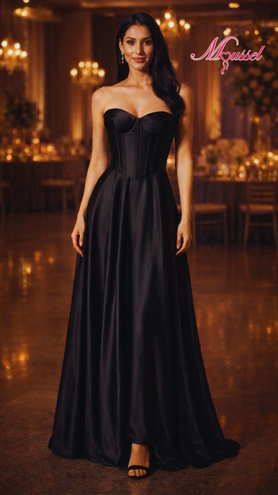Noir Corset Elegance: Vestido negro strapless con talle tipo corsé que define la silueta y falda fluida de caída perfecta. Elegancia sofisticada para una noche inolvidable