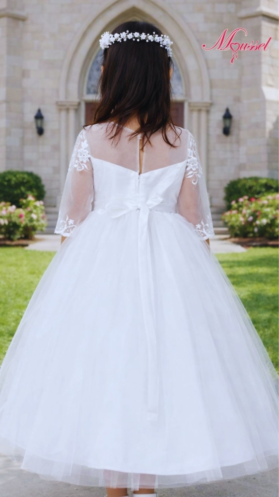 Delicado vestido de primera comunión con bordado elegante y falda amplia de tul que aporta un look dulce y clásico. Ideal para un día inolvidable. Descubre la colección de Moussel y haz que su primera comunión sea perfecta.