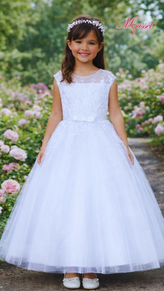 Delicado vestido de primera comunión en color blanco con falda amplia de tul y fino encaje en el corpiño. Su diseño clásico y elegante lo convierte en el vestido perfecto para una ceremonia inolvidable. Ideal para niñas que sueñan con lucir como una princesa en su día especial.