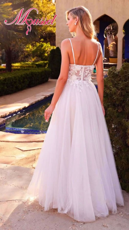 Vestido de novia línea en A, de tirante spaguetti con un talle en transparencia que le da una delicadeza al diseño. Es un vestido de novia sin cola ideal para una boda al aire libre. Vestido de venta.