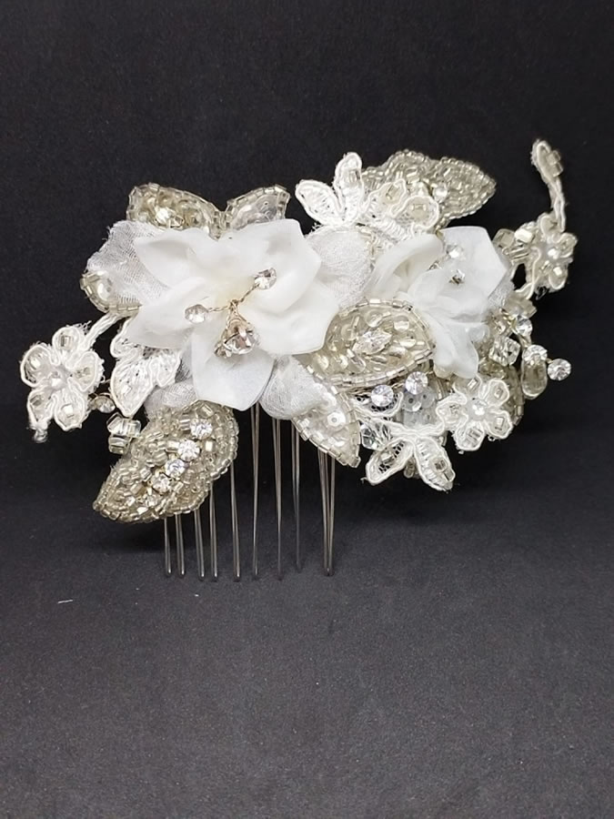 Peineta decorada con flores, hojas y cristales hecha a mano. Ideal para una primera comunión, novia o para una actividad formal. Accesorio de cabello.