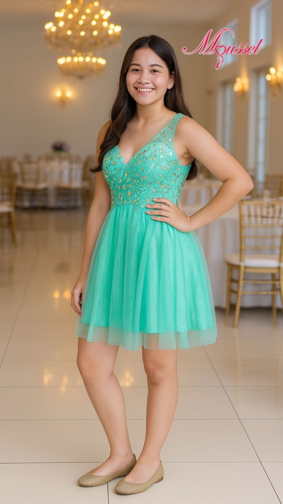 Diseño de vestido de fiesta corto en color verde menta , su talle con tirantes anchos con bordados plata y su falda de numerosas capas de tul.