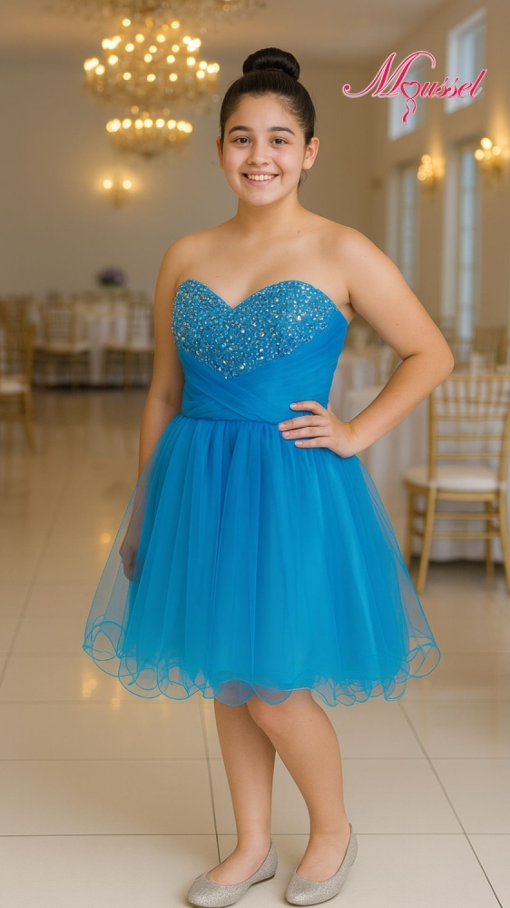 Un vestido para recordar, talle corte corazón con bordados plasta y su falda en tul turquesa. Un diseño bellísimo!