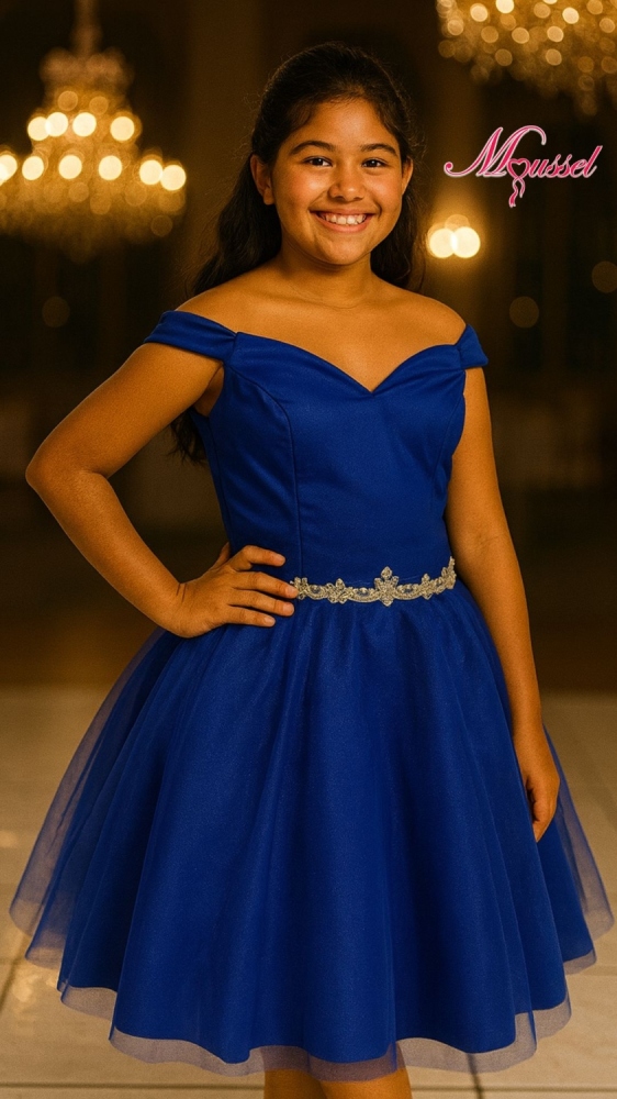 Vestido juvenil azul eléctrico con escote de hombros caídos y falda de tul. Elegante y fresco, perfecto para graduaciones, fiestas y eventos especiales.