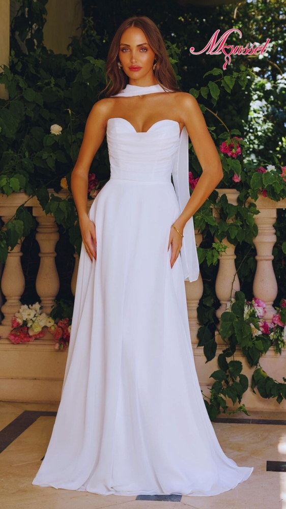 Vestido de Novia Etéreo:Diseño blanco con silueta fluida y escote favorecedor. Elegancia natural para una boda inolvidable.
