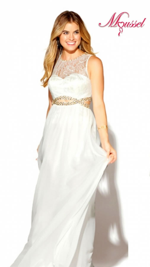 Vestido de novia estilo griego, con bordado con transparencia en el talle. Es un vestido de novia sin cola.
