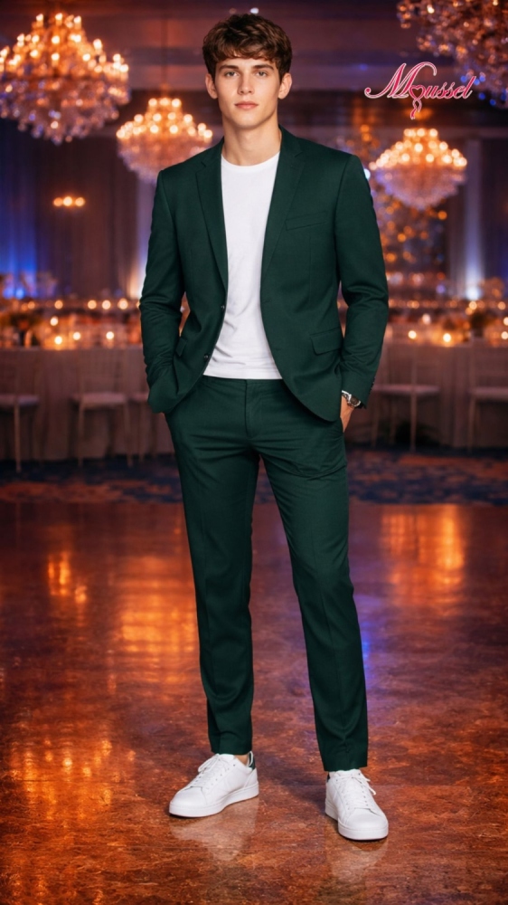 Traje verde esmeralda de corte moderno, combinado con camiseta blanca y tenis. Ideal para jóvenes que buscan estilo actual y elegante para eventos y celebraciones nocturnas.