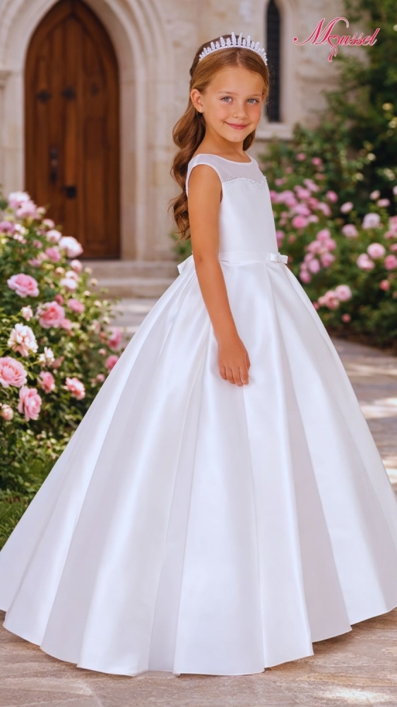 Imponente : Vestido de primera comunión largo, línea en A confeccionado en mikado tela japonesa. Es un diseño estilo minimalista, con transparencia en la parte superior del talle para darle elegancia y sobriedad. Tiene una decoración con avalorios únicamente en la parte superior del talle. Trae un cinturón co un pequeño lazo.