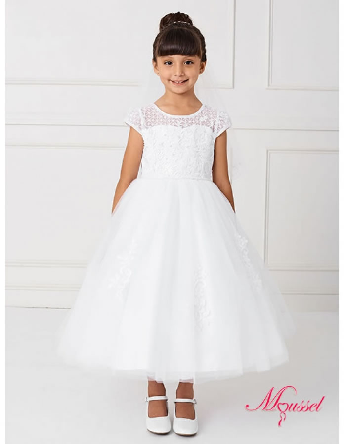 Vestido de primera comunión 3/4 de largo, su talle está confeccionado en raso francés, organza bordada y está bordado con delicadas perlas. Tiene unas hermosas mangas en organza bordada.