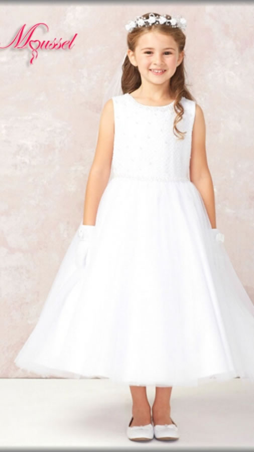 Vestido de primera comunión corto (3/4 de largo, a mitad de pantorrilla) su talle confeccionado en raso y tul bordado con perlas. Este vestido de primera comunión es un diseño clásico y delicado