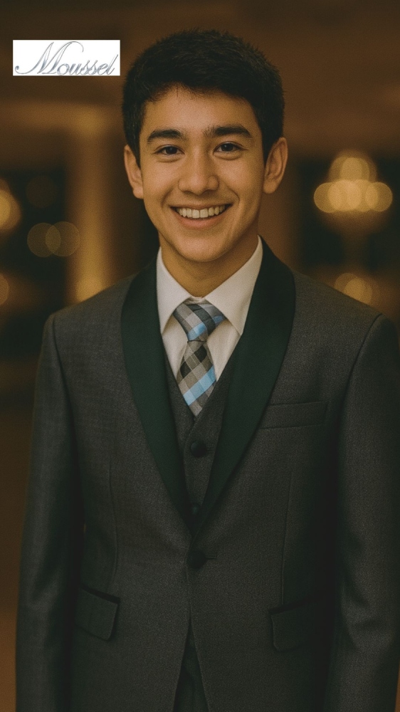 Tuxedo se denomina este traje por su solapa de satin. Ideal para actividades formales. El traje viene con 5 piezas: saco, camisa blanca, chaleco, corbata y pantalón. Este traje está en tela texturizada color gris oscuro con detalles en negro