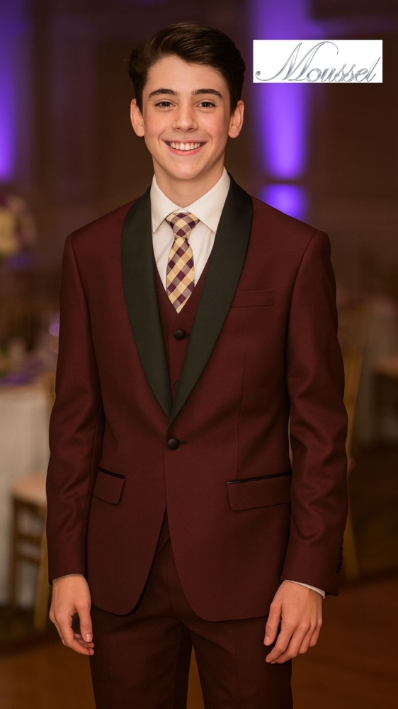 Tuxedo para adolescente o niño Su gran detalle es la solapa del traje viene confeccionada en raso mate para darle mayor elegancia al traje. Es un traje corte slim fit y viene con 5 piezas: seaco, camisa blanca, chaleco, corbata o corbatín y pantalón.