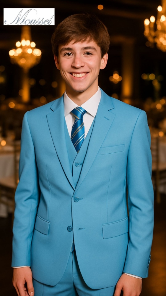 Traje para niño y adolescente en corte slim fit. Tiene su saco con solapa corte español, de 2 botones y con corte inglés atrás. El traje viene con 5 piezas: saco, chaleco, corbata, camisa y pantalón. Disponible en tallas grandes o tallas plus.