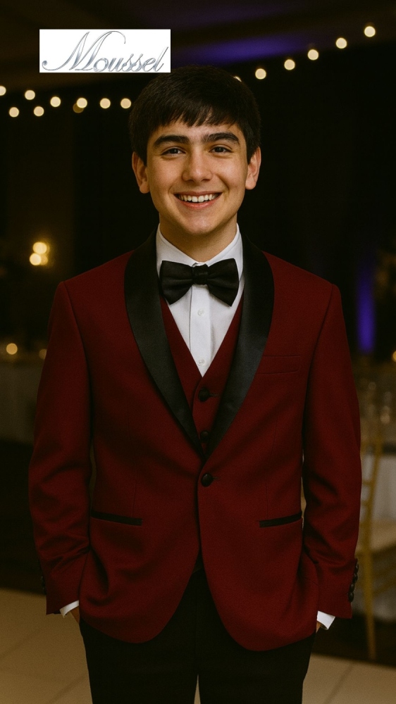 Traje para adolescente en dos tonos, es un tuxedo por su solapa en satin, de un boton y se complementa con el pantalón en tono negro.