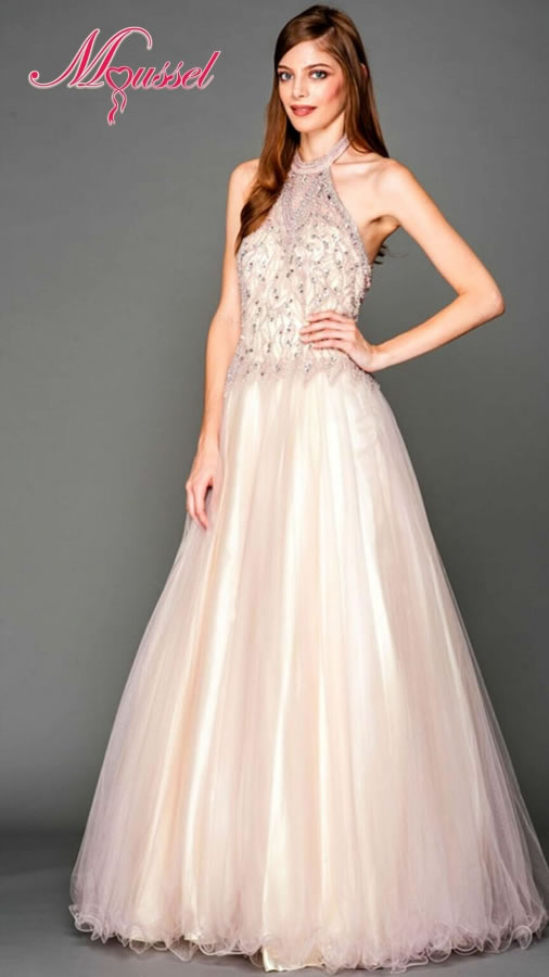 Vestido línea A oro rosa con falda de tul en capas y transparencia en el talle