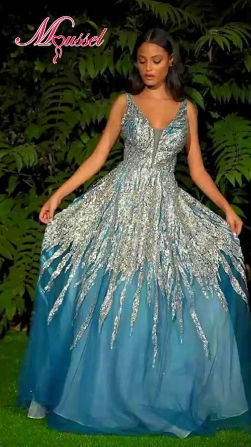 Destellos del cosmos: Bordado en cristales plata sorbres su falda en tonos azul turquesa nos remite a la inmesidad del cosmos con fluidez, ideal para una quinceañera de alfombra roja.