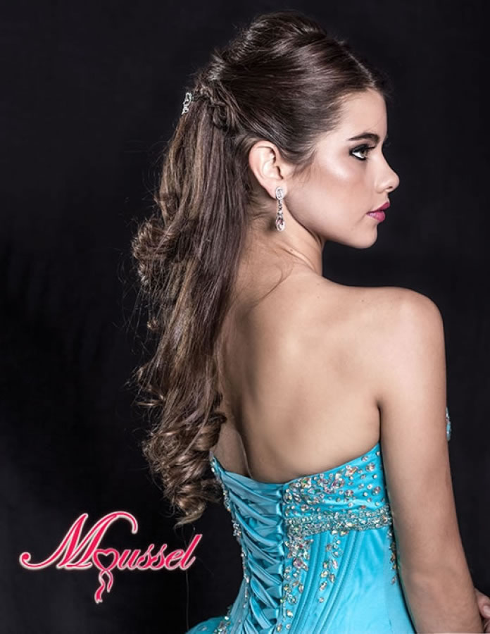 Vestido de quince años estilo princesa y strapless su talle está totalmente bordado con avalorios en tono plata.